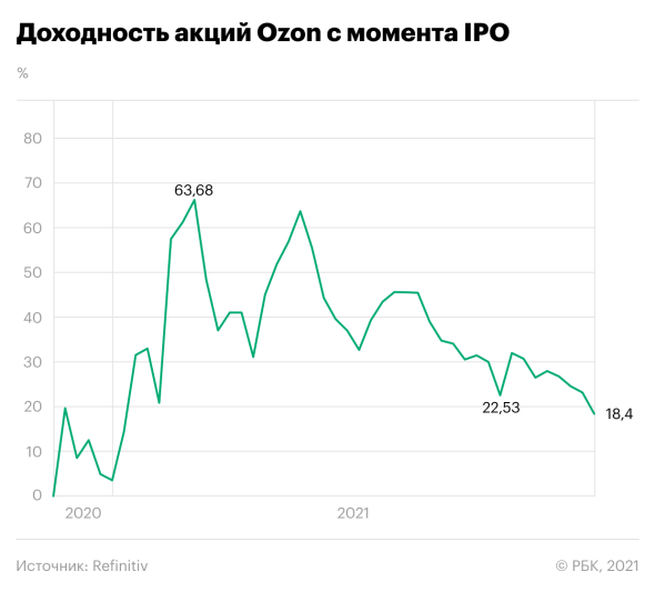 23 ноября 2020 года российский онлайн-ретейлер Ozon Holdings привлек чуть больше $1,2 млрд ($1,274 млрд без учета вознаграждения организаторов IPO), разместив в общей сложности 42,45 млн обыкновенных акций по $30 за штуку, из которых 4,95 млн бумаг были впоследствии куплены организаторами сделки. В результате размещения совокупное число обыкновенных акций компании составило почти 208,203 млн штук, а сама она была оценена примерно в $6,246 млрд.