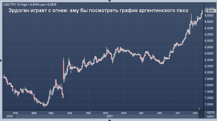 Курс турецкой лиры только что обновил исторческий минимум против доллара - 9,97. Снижение курса лиры за пределы 10 за доллар сейчас почти само собой разумеющееся, поскольку риски еще одного снижения ставки Центробанком Турции и давления на Федеральную резервную систему с целью ее повышения растут. Трейдеры опционов видят почти равную вероятность того, что к концу года лира упадет до 10,5. Это следствие ставок валютного рынка на более раннее повышение процентной ставки ФРС на фоне признаков того, что ценовое давление может сохраниться.