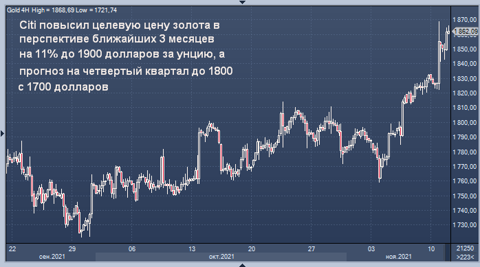 Citi повысил целевую цену золота в перспективе ближайших 3 месяцев на 11% до 1900 долларов за унцию, а прогноз на четвертый квартал до 1800 долларов за унцию с 1700 долларов.