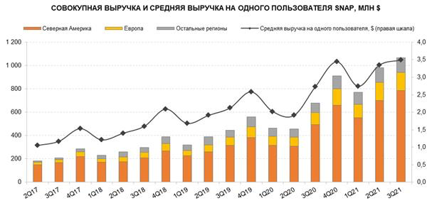 21 октября 2021 года Snap опубликовала отчетность по итогам III квартала 2021 года. За квартал компания зафиксировала выручку в размере $ 1 067 млн, что на 57% выше, чем за аналогичный квартал годом ранее. На долю Северной Америки пришлось $ 787 млн выручки (+60% г/г), на долю Европы - $ 153 млн выручки (+49% г/г), на долю международных рынков - $ 127 млн (+53% г/г).
