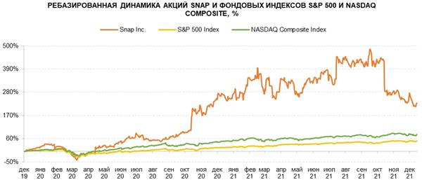 По прогнозному мультипликатору PEG на конец 2022 года акции Snap торгуются с дисконтом на уровне 41% по отношению к аналогам. Мы считаем такой дисконт неоправданным и ожидаем, что он будет сокращаться. Несмотря на то что с сентября по декабрь 2021 года акции Snap потеряли около 45% стоимости, за последние 2 года их совокупная доходность равна 225%, что существенно превышает доходности технологического индекса NASDAQ Composite (+80%) и индекса широкого рынка S&P 500 (+50%).