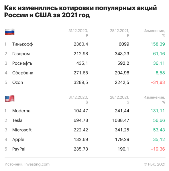 На российском рынке настоящей звездой стали акции TCS Group — головной компании Тинькофф Банка. На максимуме рост бумаг составлял 260%, а капитализация компании превышала $23 млрд. Несмотря на коррекцию на российском рынке, акции закрывают год с приростом в 150%. Бумаги другого представителя финансового сектора — «Сбера» — также выросли, но гораздо скромнее — всего на 10%. Нефтегазовый сектор, который был аутсайдером в прошлом году, отыграл все потери, а акции даже обновили исторические максимумы («Газпром», «Роснефть»). Одним из главных разочарований стали бумаги Ozon, которые начали торговаться на Московской бирже в конце ноября прошлого года. По итогам 2021-го акции подешевели более чем на 30%.