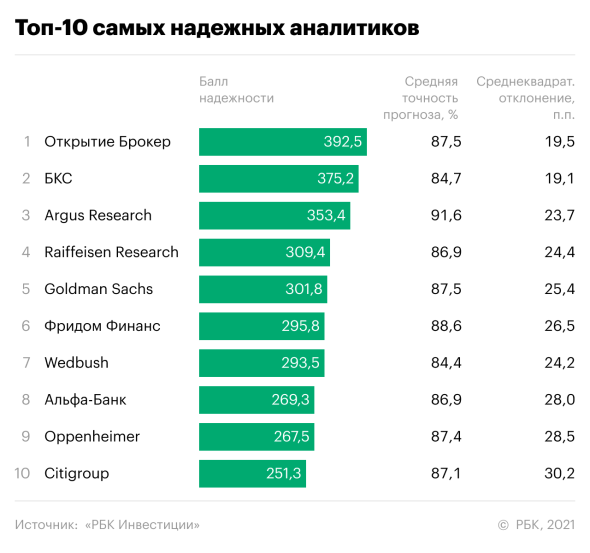 Поэтому мы также подготовили топ-10 самых надежных аналитиков. Ранжирование было сделано по специально рассчитанному баллу надежности, который учитывает как среднюю точность прогнозов, так и отклонения от этой середины.
