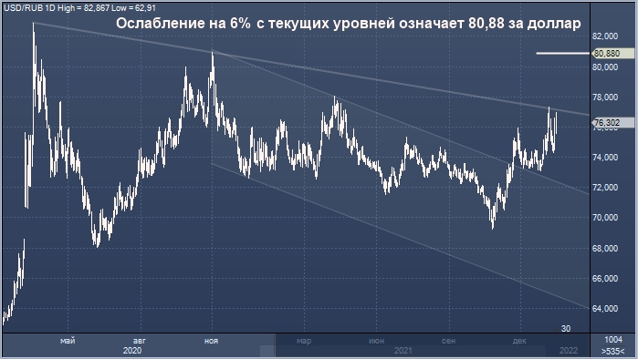 В среднем в этом году курс рубля ожидается на уровне 75–76/$, а в случае санкций к госдолгу РФ он может быть слабее на 3–6%, говорится в обзоре Ренессанс Капитала. Санкции также приведут к расширению спредов ОФЗ на 80–120 б.п., пишут аналитики Софья Донец и Андрей Мелащенко.