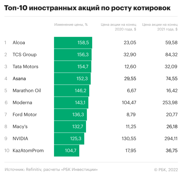 В числе самых доходных акций по две бумаги горнометаллургических компаний (Alcoa и KazAtomProm) и автопроизводителей (Tata Motors и Ford Motor). Шесть других акций представляют каждая отдельный сектор: TCS Group — финансы, IT сектор — Asana, Marathon Oil — от нефтегазового сектора, Moderna — от биофармы, Macy's — от ретейла, а также NVIDIA как представитель производителей электроники.