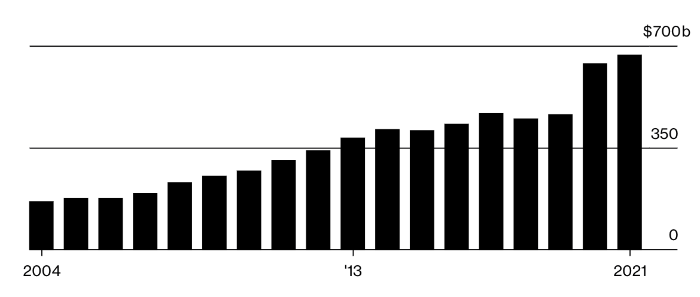 Долги компаний также на удивление невелики по сравнению с доходами. В конце 2021 года соотношение чистого долга к Ebitda —годовой прибыли до вычета процентов, налогов, износа и амортизации — было чуть выше 1 для компаний S&P 500, что является рекордно низким показателем, по данным Bloomberg, начиная с 1990 года. В 2007 году, до глобального финансового кризиса, это соотношение составляло 4.25, а в 1999 году, перед крахом пузыря доткомов, — 3.88.