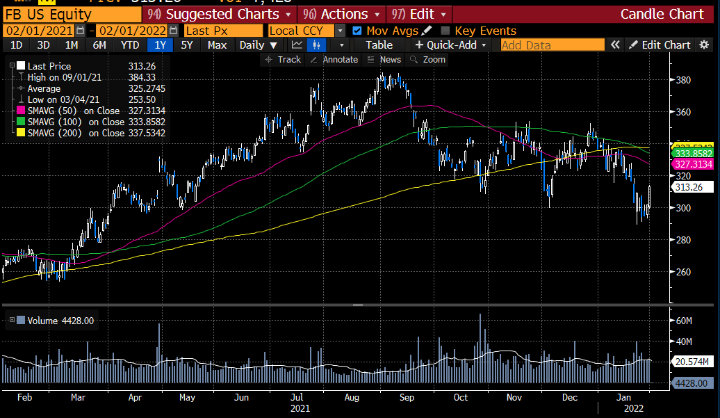 Динамика цены за акцию Meta (FB US), объемы торгов и скользящие средние