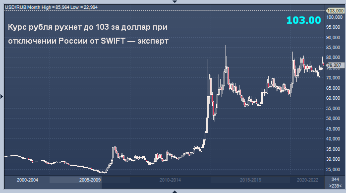 Рубль может подешеветь в 2022 году до 81-103 за доллар США в зависимости от жесткости санкций, максимальные из которых предполагают отключение от SWIFT, прогнозирует BCS Global Markets.