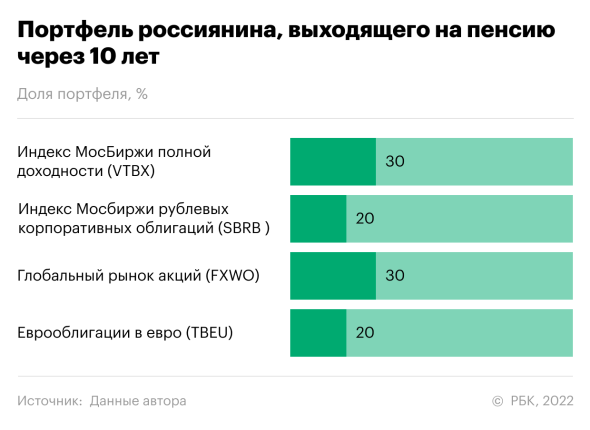 Для простоты разделим портфель ровно пополам на рублевые и валютные активы. Получим по 30% в двух фондах акций (VTBX и FXWO) и по 20% в фондах облигаций (SBRB и TBEU). Годовая доходность индексов, которые лежат в их основе, составляет 8–10% в облигациях и около 17% в акциях. В среднем такой портфель будет приносить 14% в год.