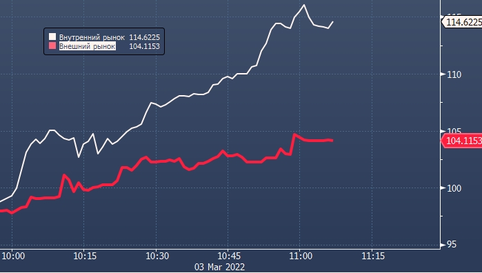 Что интересно, если раньше курс рубля на внутреннем рынке был на 12-15 рублей ниже чем на внешнем, то теперь ситуация изменилась ровно на 180 градусов. Теперь курс доллар/рубля на Мосбирже выше внешнего курса примерно на 12 рублей. Это говорит о том, что спрос на валюту внутри страны превышает спрос на валюту за границей. Дело в том, Банк России предписал с 9:00 3 марта взимать комиссию не менее 30% при покупке физлицами долларов, евро и фунтов на бирже, сообщила пресс-служба ЦБ.
