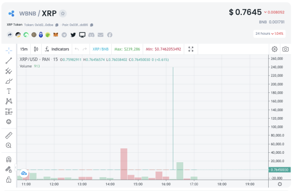 Курс криптовалюты XRP на децентрализованной криптобирже PancakeSwap в моменте поднимался на 31 019 296%, после чего вернулся к прежним значениям. Цена монеты достигла $239 тыс., затем она вновь опустилась до среднерыночной около $0,76.