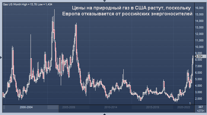 В среду эталонный показатель природного газа Henry Hub установился на уровне 8,415 долларов за миллион британских тепловых единиц, что более чем вдвое превышает цену в начале года и намного превышает средний показатель в 3 доллара за предыдущие 10 лет.