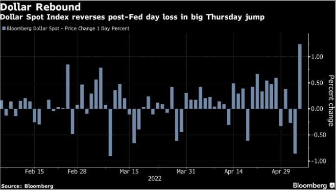 После краткого падения в среду, когда акции и облигации прибавили в цене, поскольку председатель ФРС Джером Пауэлл убрал ожидания возможного повышения ставок сразу на 75 б.п. на предстоящих заседаниях, доллар резко вырос в четверг. Этот рост отразил возобновление бегства от риска, поскольку акции и казначейские облигации, на позитивной ноте завершившие среду, в четверг возобновили падение.