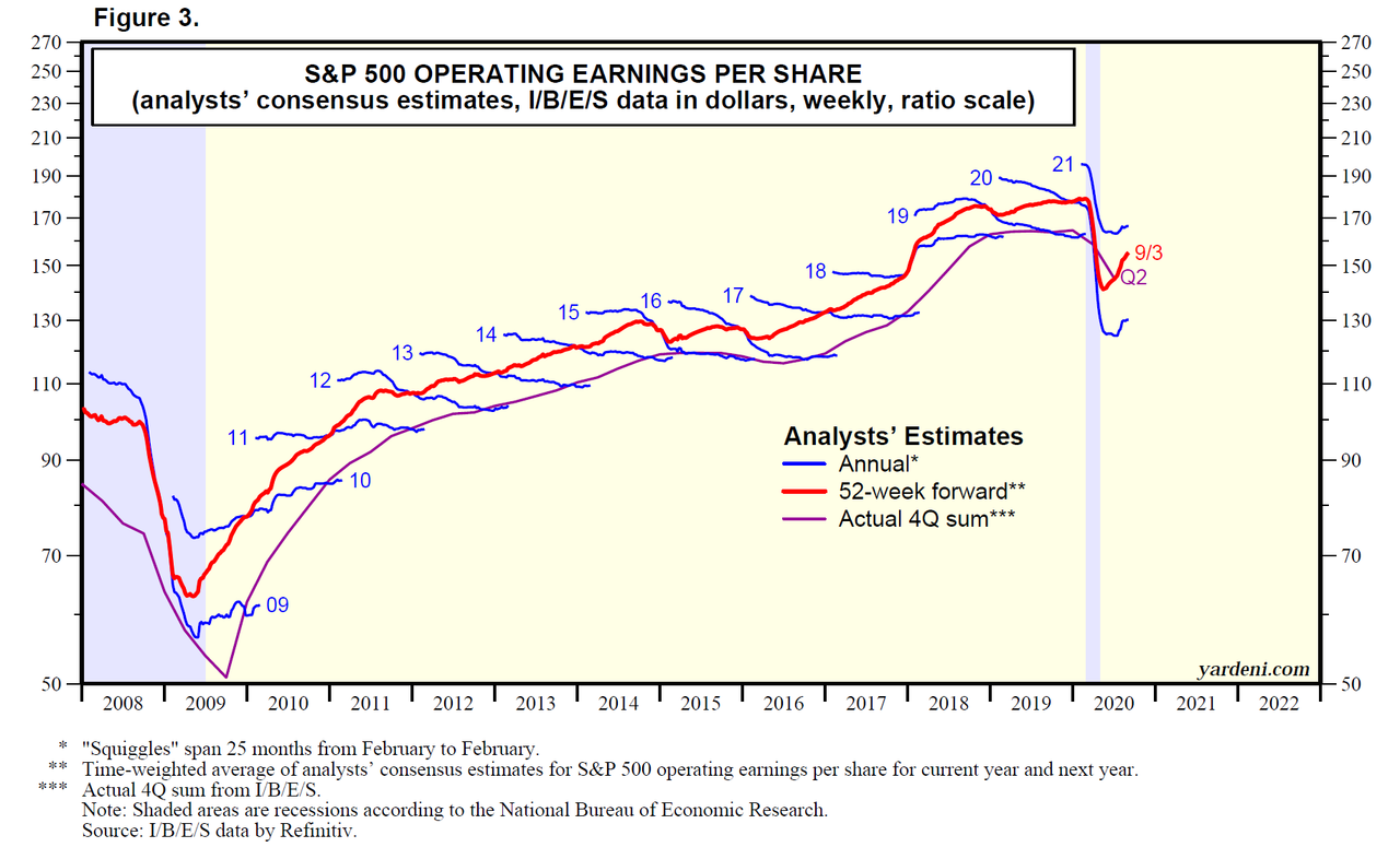 Казалось бы, здесь гипотеза о падении прибылей и последующей безработице не стыкуется с реальностью, как минимум в течение ближайших кварталов. Но можно ли назвать «толковыми» прогнозы прибыли по S&P 500? Дело в том, что весьма развитая индустрия весьма крупно и с завидным постоянством ошибается в своих оценках. Вот, например, одна из вариаций графика с такими прогнозами от Yardeni Research: