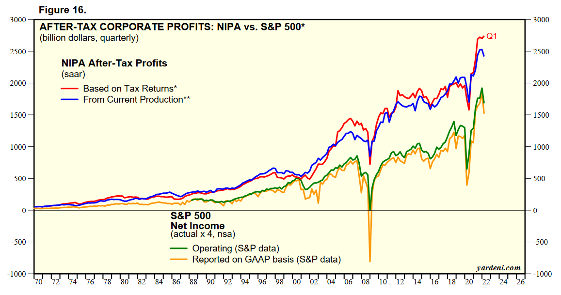 Крайние доступные данные — за 1 квартал 2022. Номинальная прибыль корпораций остаётся примерно на одном и том же уровне уже четыре квартала подряд. Признаков падения не наблюдается. Этот уровень примерно на 40% выше, чем допандемийное плато 2012-2019, что косвенно говорит о высоком запасе прочности.