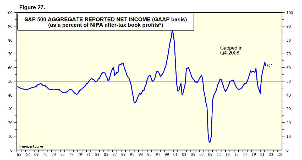 Во-вторых, толковых прогнозов по национальной прибыли корпораций попросту нет. Зато есть весьма развитая индустрия по прогнозированию прибыли публичных компаний, обращающихся на рынке акций. В настоящий момент сальдированная прибыль компаний из индекса S&P 500 составляет более 60% от сальдированной прибыли по всей экономике: