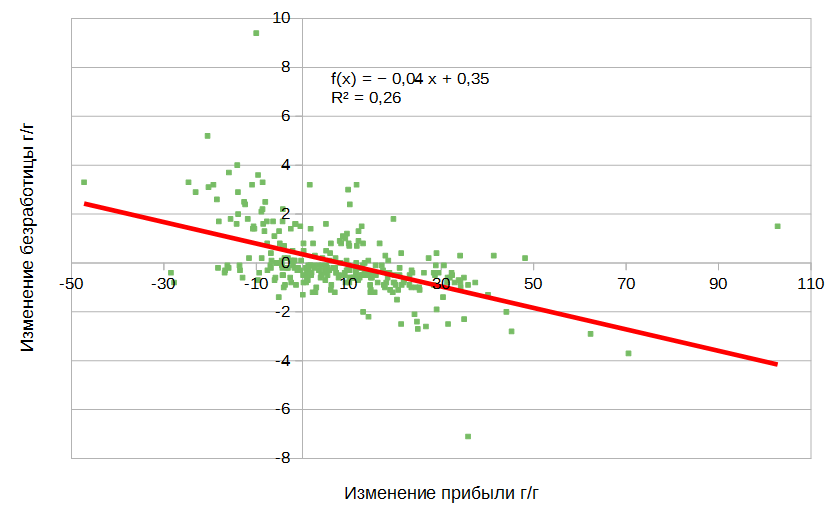 Наиболее тесная связь получается, если мы сравниваем годовые темпы изменения номинальной прибыли и безработицы. Прибыль при этом является опережающим индикатором; лаг = 1 квартал: