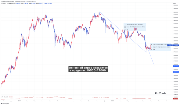 Волатильность на биткоине по отношению к S&P500 выше в 3 раза, что создает возможность коррекции в область $19,5-17 тыс. Такие падения рынков не являются чем-то из ряда вон выходящим, скорее это переосмысление справедливых цен и «разгрузка» (выход с убытками розничных трейдеров и инвесторов).
