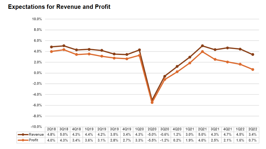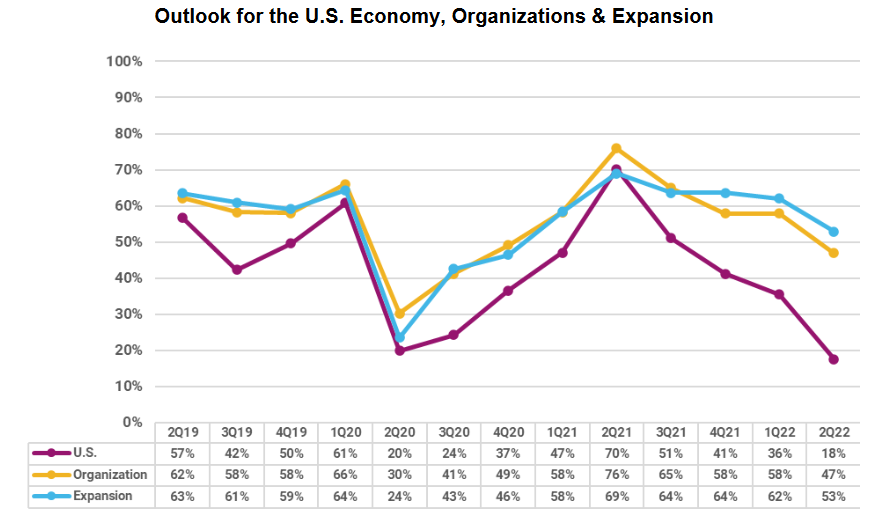 Респонденты буквально «хоронят» американскую экономику: нынешние ожидания хуже, чем на дне пандемии. Крайний раз такой пессимизм наблюдался в далёком 2011. Самое любопытное, что все уверены, что их организация будет находиться в гораздо лучшей форме, чем окружающая экономика. Такое расхождение может быть вызвано рекордной нынешней рентабельностью и всё еще высоким текущим уровнем деловой активности. Своего рода «головокружением от нынешних успехов». Которое, боюсь, достаточно быстро сменится паникой, когда текущие показатели начнут проседать вместе с макро-обстановкой.