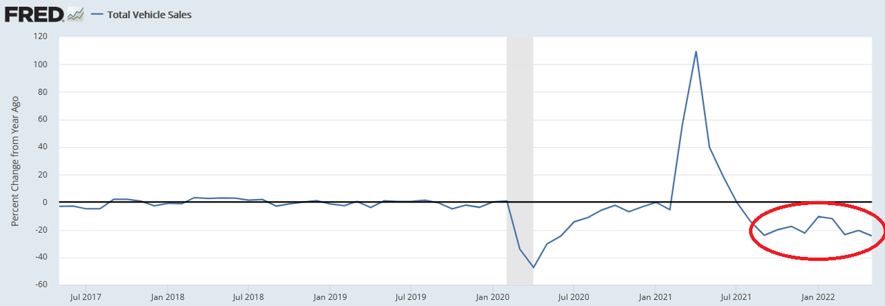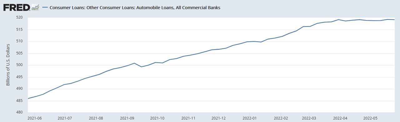 Мы видим, что, начиная с апреля, автомобильный кредит прекратил расти и пока стагнирует. Схожая ситуация наблюдалась в 2017 и 2018, во время предыдущего эпизода ужесточения монетарной политики Федрезервом.