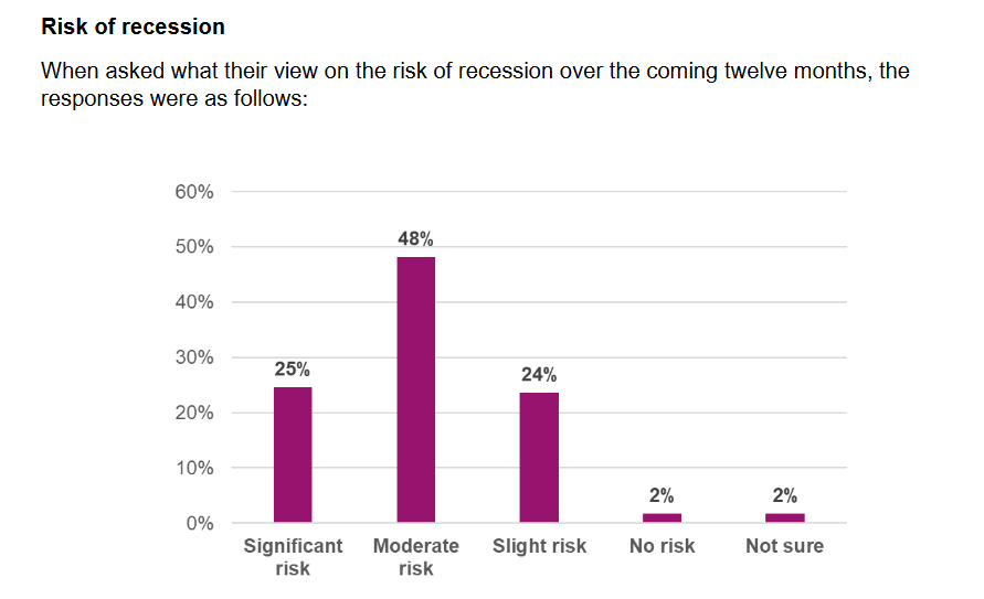 Economic Outlook Survey: 25% респондентов видят значительный уровень риска рецессии в ближайшие 12 месяцев, 48% — умеренный уровень риска. Только 2% считают, что такого риска нет.
