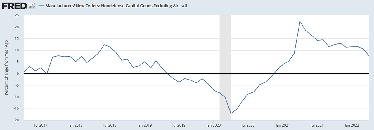 Во-первых, годовая динамика здесь отражает эффект относительно высокой базы в мае 2021. Этот эффект проявляется уже несколько месяцев подряд, и было бы неправильно записывать его только в заслуги ФРС: