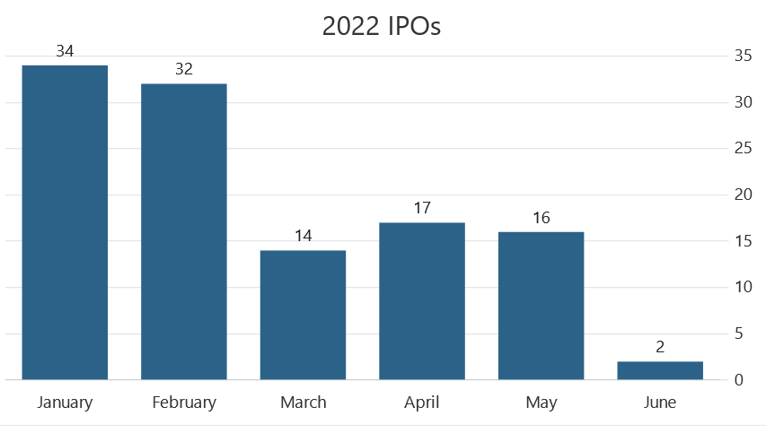 Для сравнения, в марте, апреле и мае 2021 на биржу вышли 151, 49 и 46 компаний соответственно. Так что получается падение в разы.