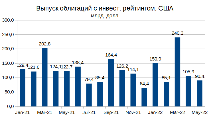 Выпуск облигаций с инвестиционным рейтингом пока держится неплохо. Хотя объем эмисии в мае 2022 упал на 26% г/г. Но для такого волатильного индикатора это не очень много: