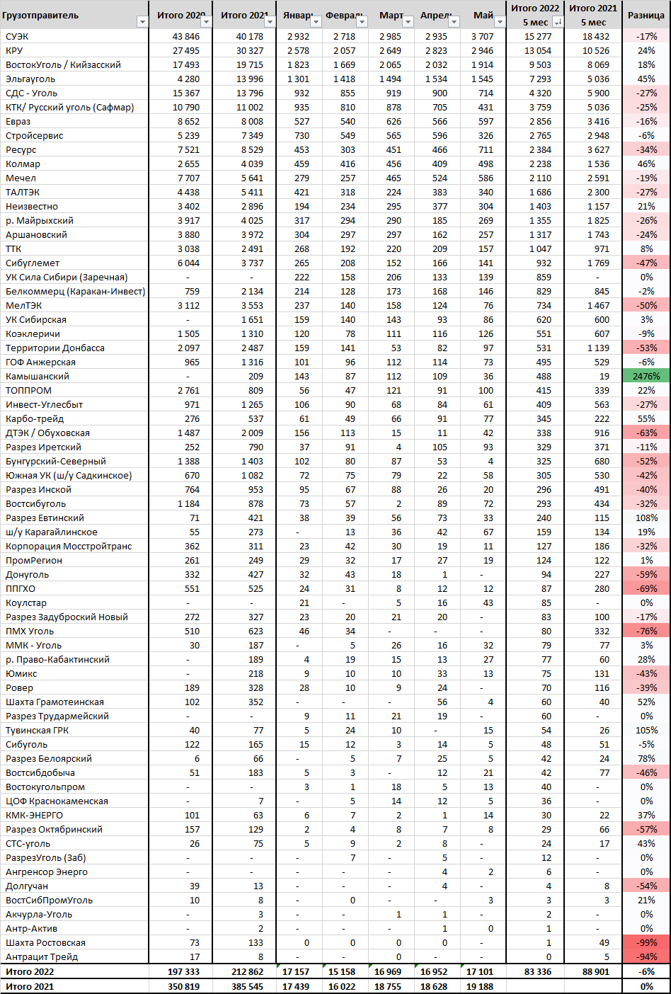 Динамика по компаниям разнонаправленная, но какого-то значимого снижения не видится. Стоит выделить парней из Якутии - Колмар и Эльгу, которые вовремя "вышли" в Саху и не испытывают проблем с отгрузками на восточный полигон. Мечел держится молодцом, но я лично потерял к нему интерес после кидалова с префами. Общее разочарование какое-то, не болею больше за Зюзина и жалею, что не могу переложится в иностранный уголь. Да и с Распадской какая-то засада с последним снижением цен на акции.