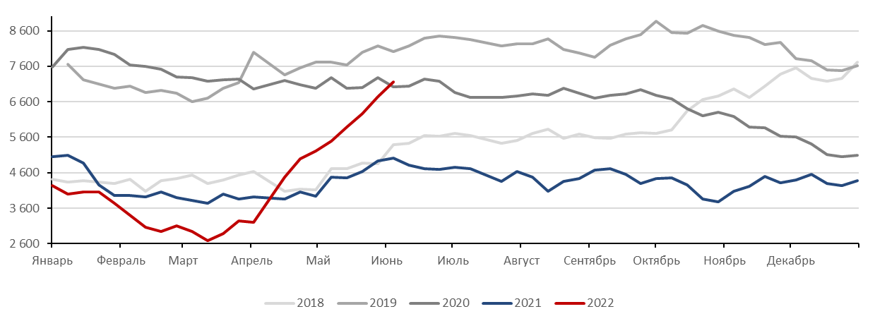 Динамика запасов в портах ARA за 2018-2022, тыс. тонн