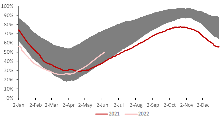 Также продолжается закачка газа в хранилища - заполненность почти выходит на среднюю заполненность за 5 лет. А именно с газом уголь конкурирует в энергобалансе стран Европы.