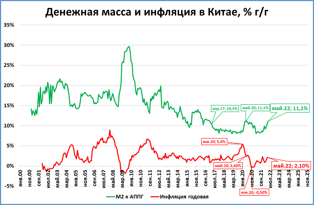 В мае инфляция в Китае не выросла (2,1%), а темпы роста номинальной денежной массы поднялись до 11,1% (10,5% по итогам апреля).