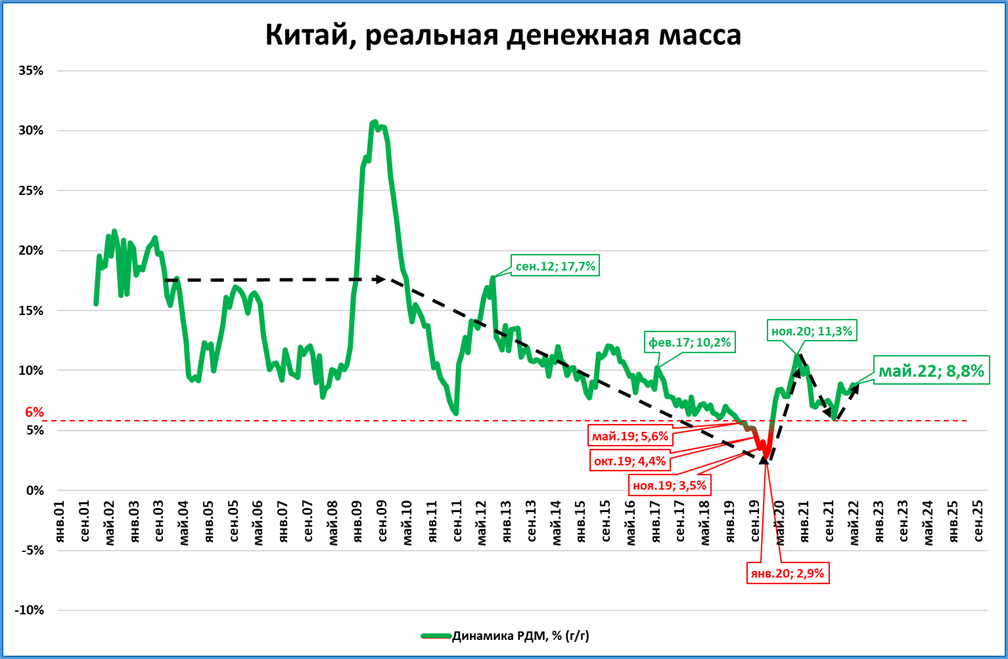 Стабильный рост реальной денежной массы говорит о том, что выходя из последствий масштабных карантинов, экономика Китая будет восстанавливаться до привычных “доковидных” темпов роста в 6-7% ВВП, характерных для 2017-2018 годов.
