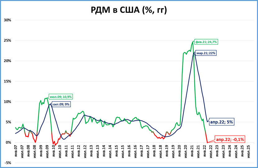 Но будущая траектория среднегодовых темпов РДМ понятна по красно-зелёной линии, а значит вал негативных новостей и прогнозов из США будет нарастать.