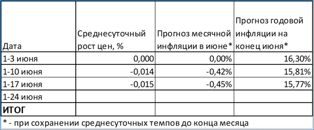 Если такие темпы сохранятся до конца месяца, то годовая инфляция в июне опустится до 15,8%.
