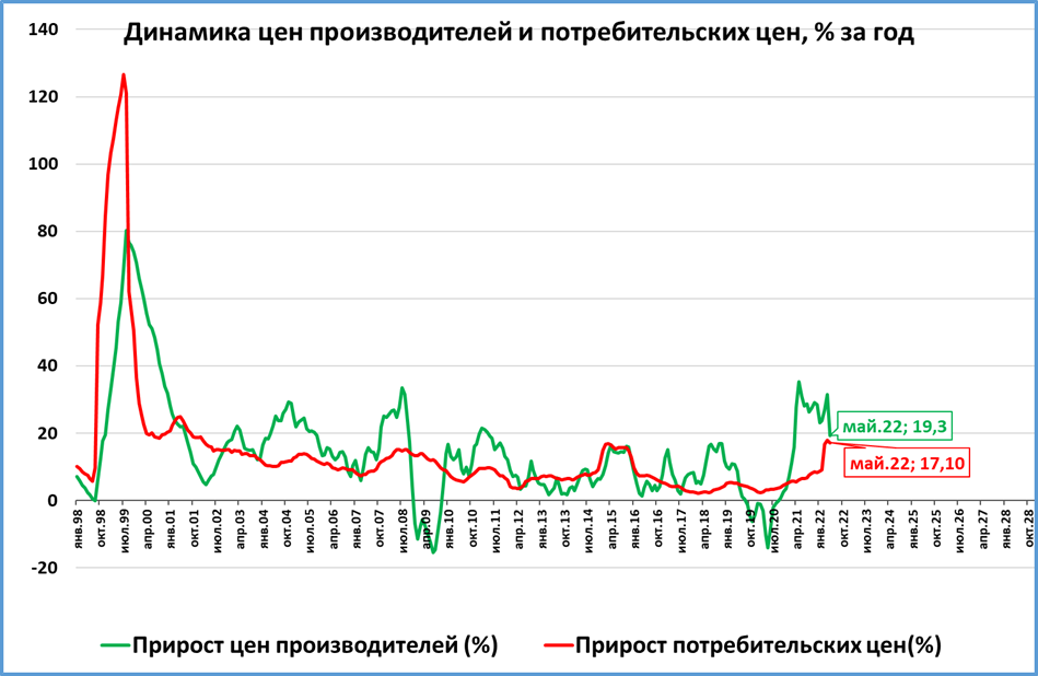 Это всего лишь на пару процентных пунктов выше, чем рост потребительских цен за тот же период (17,1%). Значит, в реальном выражении цены производителей почти не растут.