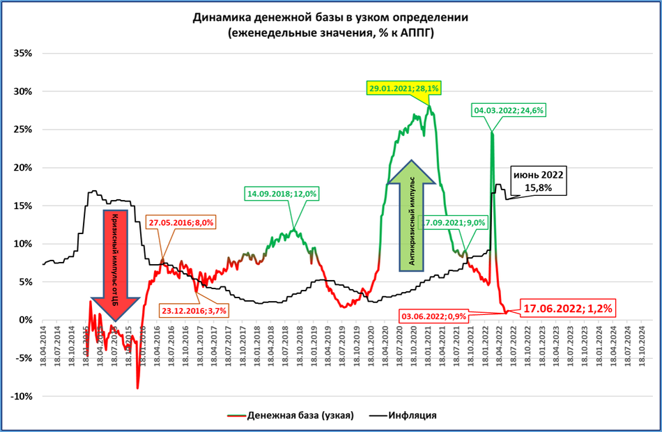 Идеальным для экономики сигналом был бы рост узкой денежной базы темпами, на 15-20 процентных пунктов превышающими инфляцию. При нынешней инфляции (около 15%) это рост на 30-35%.