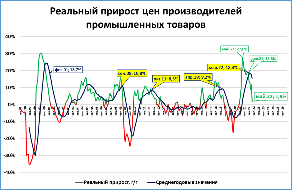 Это негативный сигнал - когда цены производителей падают в реальном выражении - это явный признак кризисных явлений в экономике (см. красные участки на графике выше).