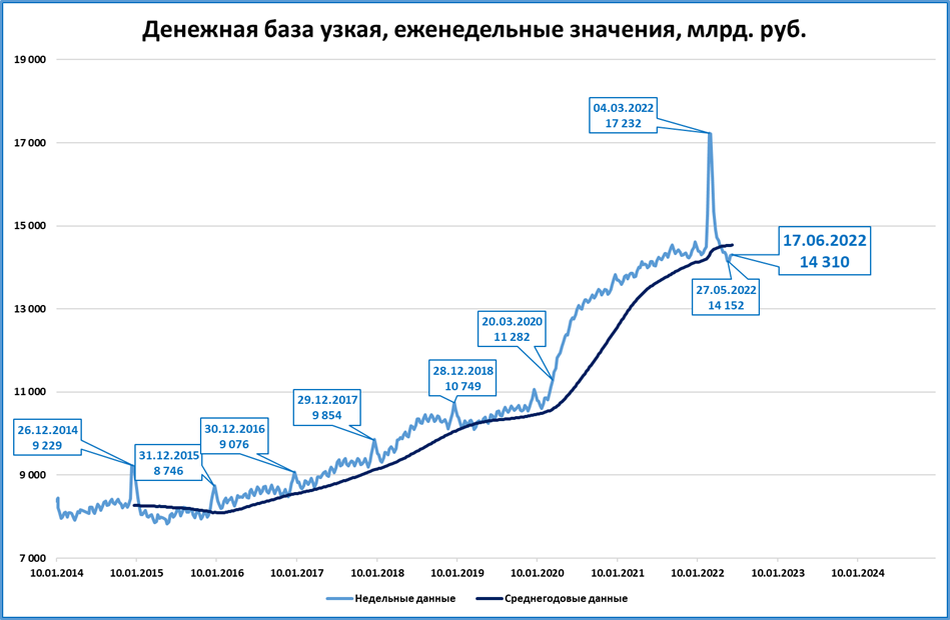 Узкая денежная база стабилизировалась на уровне около 14 трлн. рублей.