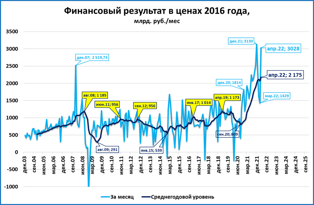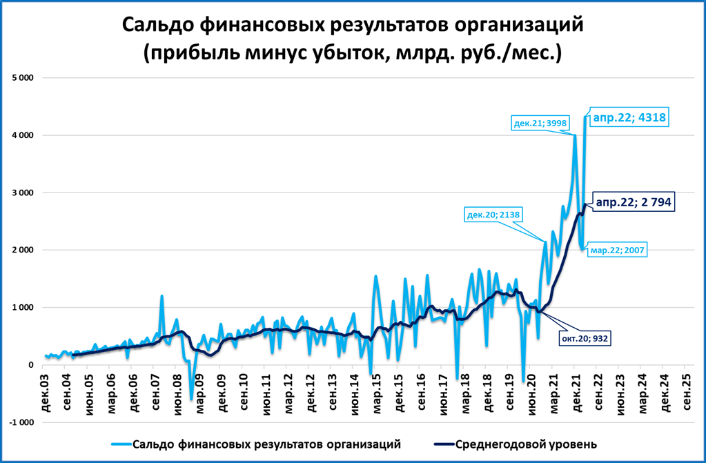 Сальдо финансовых результатов организаций (далее – прибыль*). в апреле приросло на 4318 млрд. рублей, что является лучшим результатом за всю историю наблюдения.