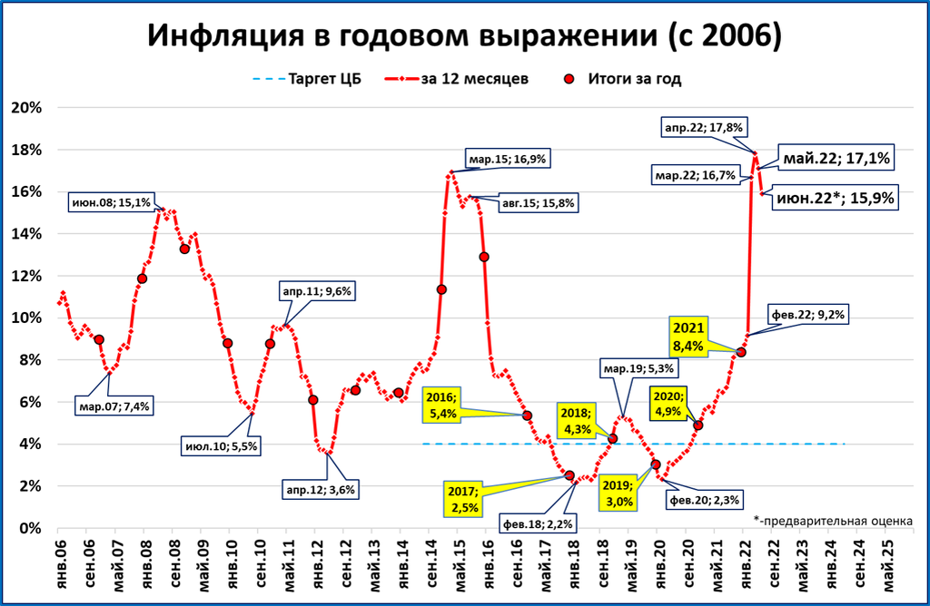 ● Оценка инфляции в июне сместилась с 15,8 до 15,9%.