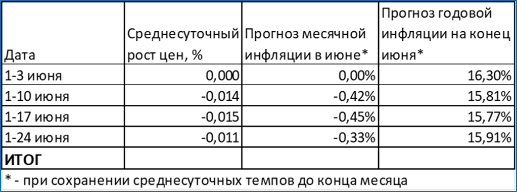 Инфляция по итогам июня ожидается на уровне 15,91%. Неделю назад мы ждали 15,77%.