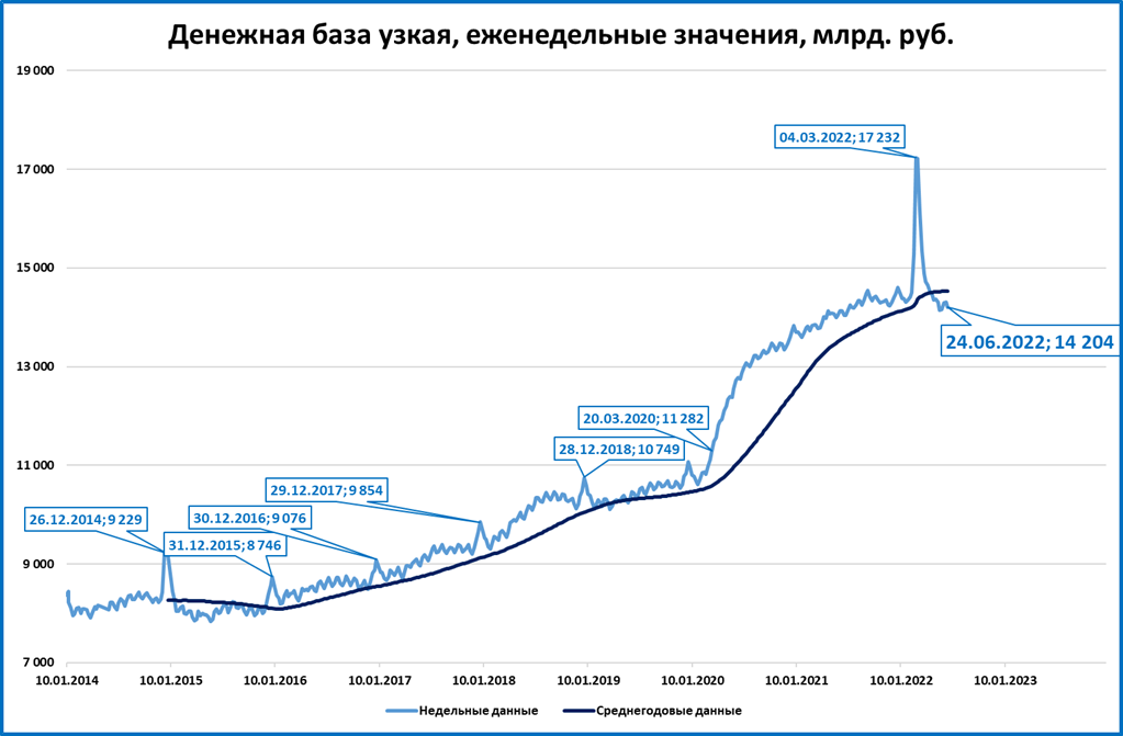 Узкая денежная база (УДБ) стабилизировалась на уровне 14,2 трлн. рублей. Об этом говорят данные ЦБ на 24 июня.