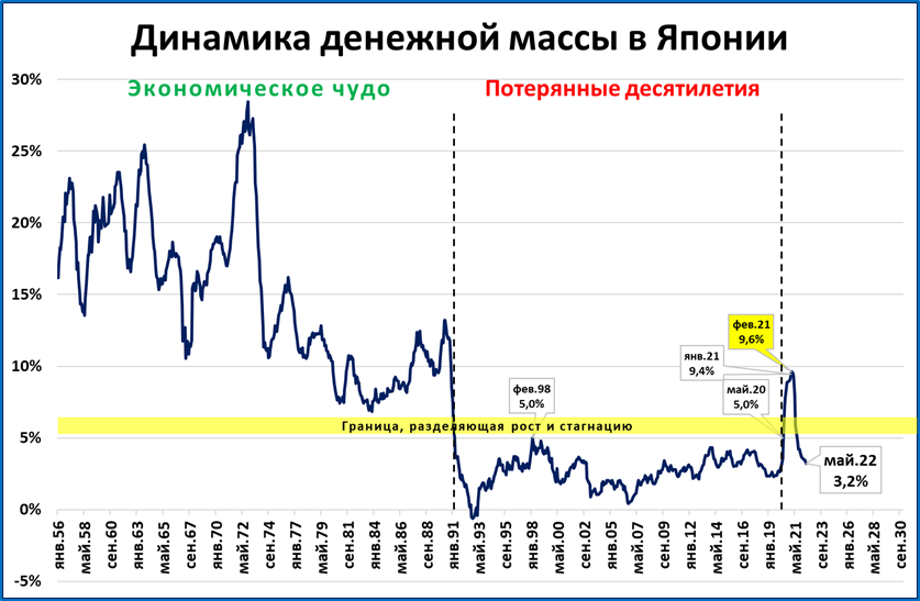 Сейчас ситуация повторяется: цены растут всё быстрее, денежная масса - всё медленнее. Это создаёт предпосылки для замедления (и без того невысоких) темпов роста ВВП Японии.