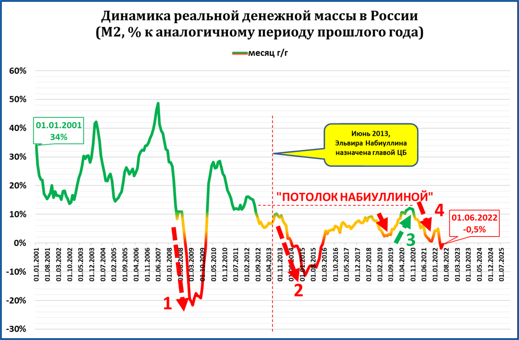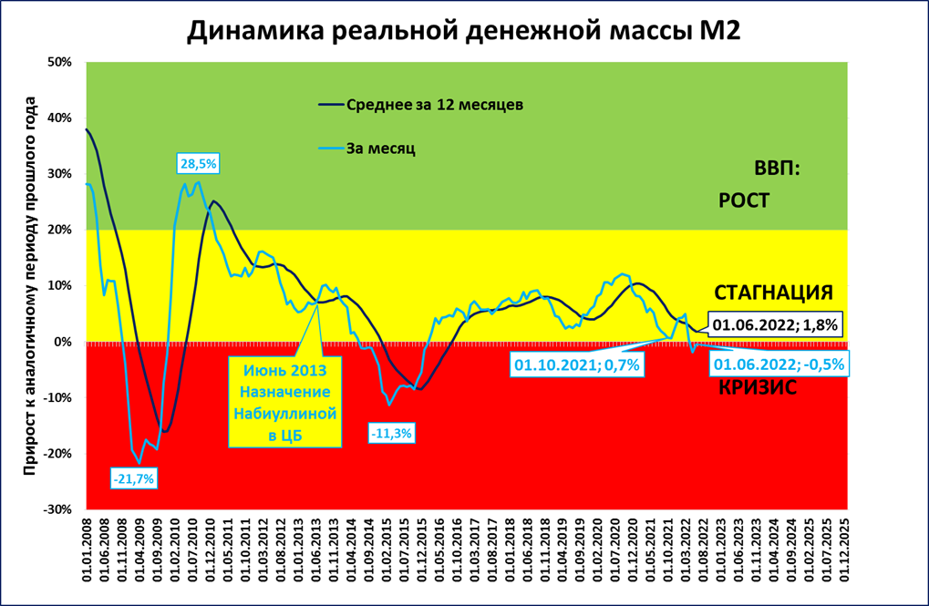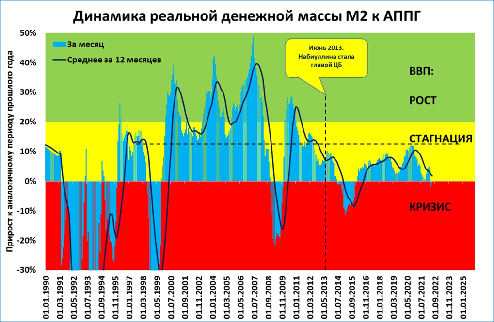 Этот же график за более долгий период наглядно показывает, что с момента назначения главой ЦБ Эльвиры Набиуллиной, денежно-кредитная политика предписывала экономике лишь стагнацию или кризис.