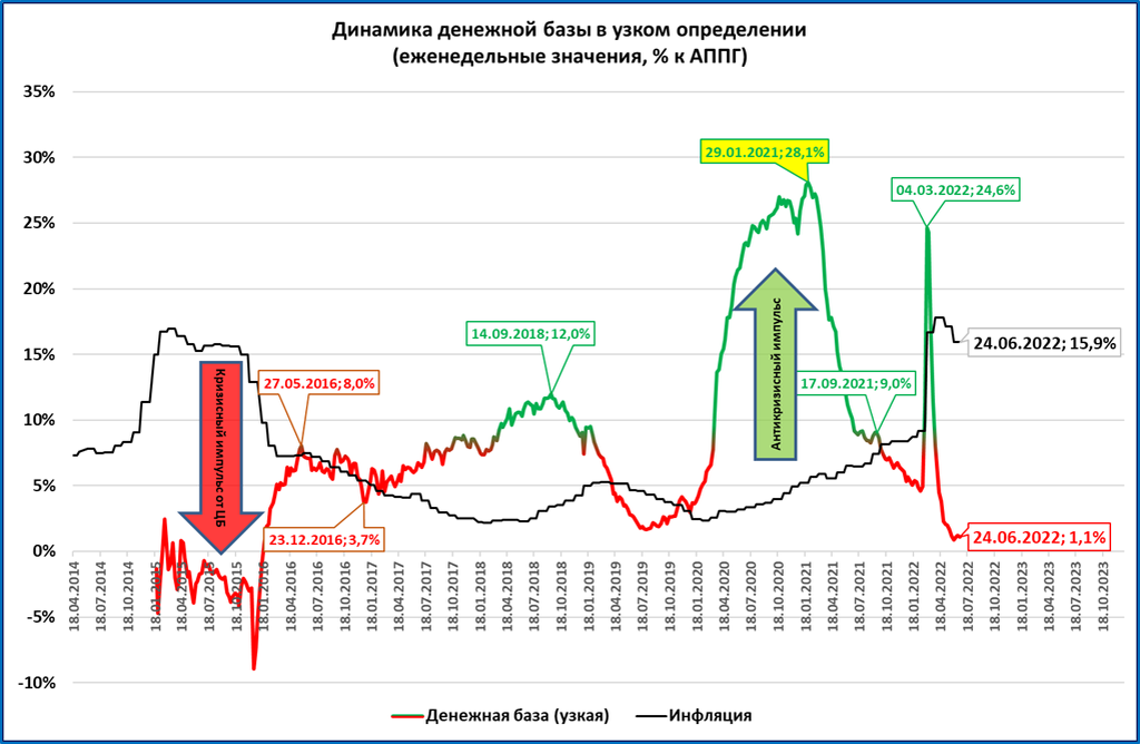 Но РДМ в минусе, то есть денежная масса растёт медленнее цен.