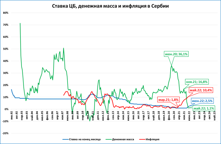 Во-вторых, в Банке Сербии ошибочно решили, что, если цены в Сербии и растут, то растут из-за того, что денег в сербской экономике после пандемии стало слишком много (то есть, население и предприятия слишком разбогатели и платёжеспособный спрос слишком велик). Банк, опять же ошибочно, принялся замедлять прирост денежной массы экономики — и, к сожалению, преуспел в этом: темпы роста номинальной денежной массы с 36% в июне 2020 года и 17% в ноябре 2021 года к маю 2022 года снизились до мизерных 1%.