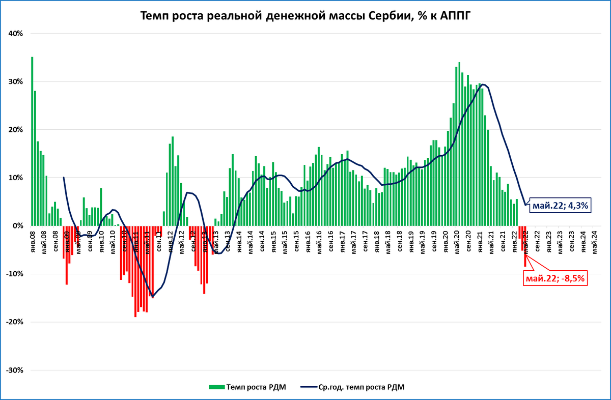 Почему же, при всех козырях относительных экономических преимуществ, сербский локомотив вдруг замедлил свой бег и грозит к концу года остановиться? Главная причина - в стране неожиданно прекратил расти совокупный платёжеспособный спрос. Иначе говоря, население и предприятия Сербии «вдруг» перестали богатеть: если до весны прошлого 2021 года реальная (то есть, поправленная на инфляцию) денежная масса сербской экономики росла со скоростью до 30% в год, то весь оставшийся 2021 год темпы её роста неуклонно падали - до 4-5% в январе-феврале 2022 года. А к маю и вообще ушли в минус: совокупный платёжеспособный спрос сербской экономики рухнул на 8,5% в годовом исчислении.