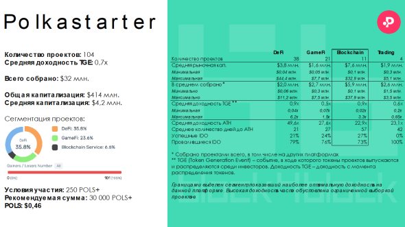 Как можно понять из левой части слайда, наибольшее количество проектов, собиравших средства на Polkastarter, относятся к категории DeFi. Всего на платформе было размещено 38 DeFi проектов, из них лишь 21% по итогу не опустились ниже цены размещения. Также следует обратить внимание на показатели, связанные с ценой токена на исторических максимумах (ATH). Действительно, если вы в среднем держали бы токен размещающегося на Polkastarter DeFi проекта 21 день, то могли бы надеяться на доходность до 4900%, но с учетом процента «выживаемости» проектов, это было бы самым настоящим казино без каких-либо шансов на фундаментальный прогноз.
