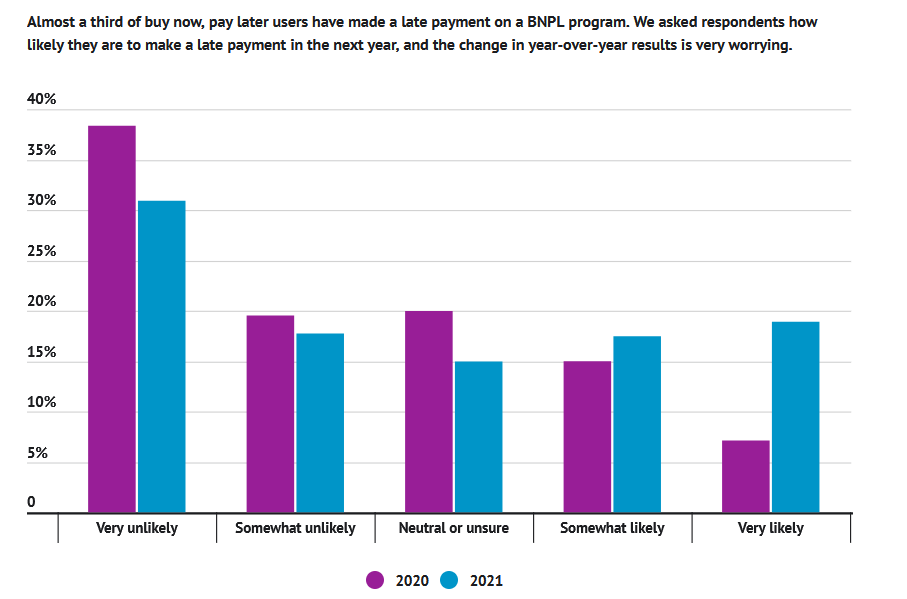 Для понимания перспектив полезно посмотреть на тематические маркетинговые опросы. Вот красноречивая статистика от компании ”Ascent”, собранная в марте 2021. 25% клиентов сервисов рассрочки воспользовались ими, потому что потеряли доход. 31% клиентов хоть раз просрочили оплату (притом, что рассрочка в большинстве случаев даётся на 1,5 месяца). И следующая цифра прекрасно показывает, что сервис ориентирован на людей с низкой финансовой грамотностью: среди возрастной группы 18-24 года просрочку допустили внушительные 47% клиентов.